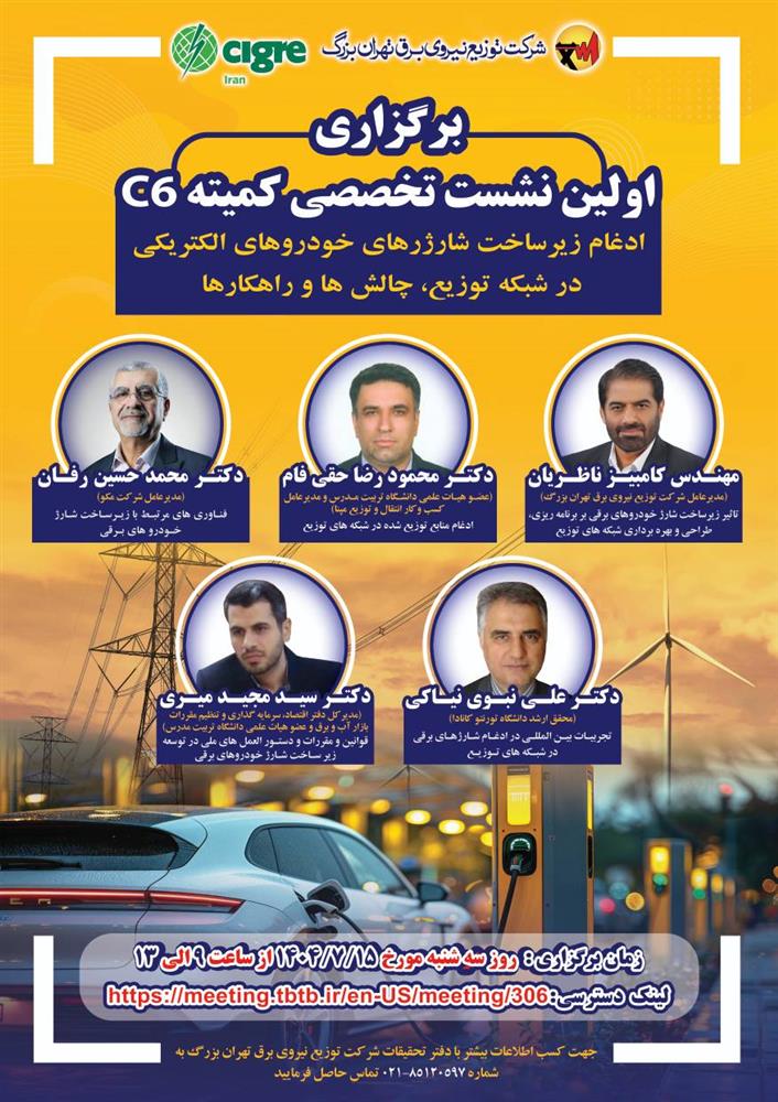 لینک اصلیسمينار مجازي کميته مطالعاتي شبکه هاي توزيع فعال و منابع انرژي توزيع شده سيگره ايران با عنوان "ادغام زيرساخت شارژرهاي خودروهاي الکتريکي در شبکه توزيع، چالشها و راهکارها" روز سه شنبه مورخ 15 مهر ماه 1404 از ساعت 9 الي 13 برگزار مي گردد.